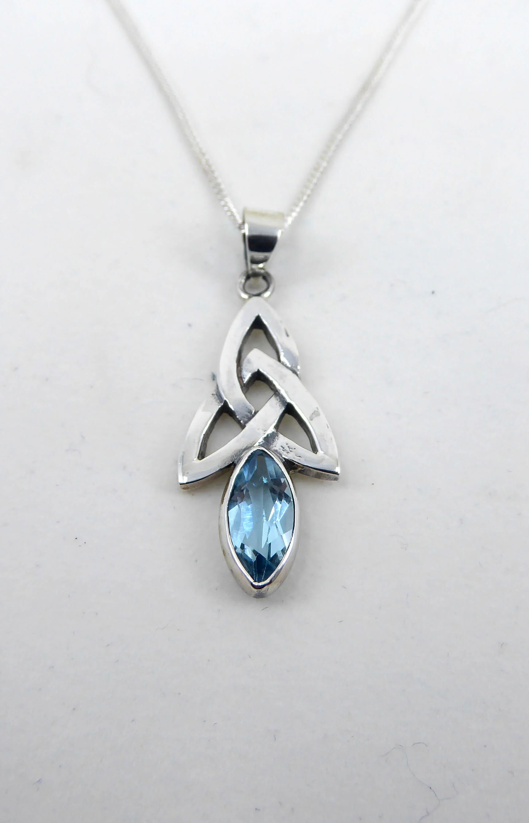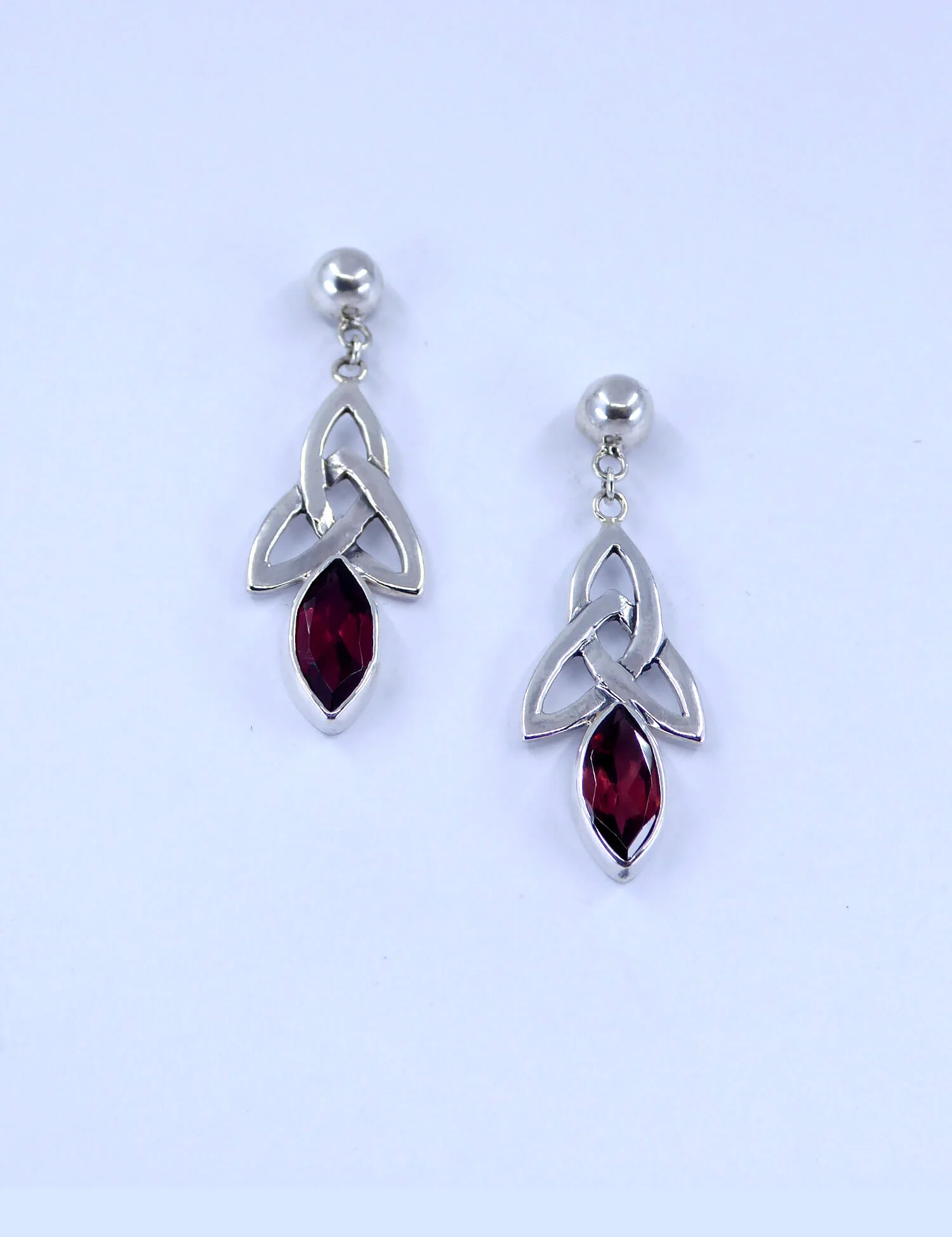 A polished silver dangling earring that broadens gently as it lengthens to a Celtic knot that is cut out for a more three-dimensional effect before tapering to its end. The solid appearance of plain silver and clean lines make for a smooth simplicity.