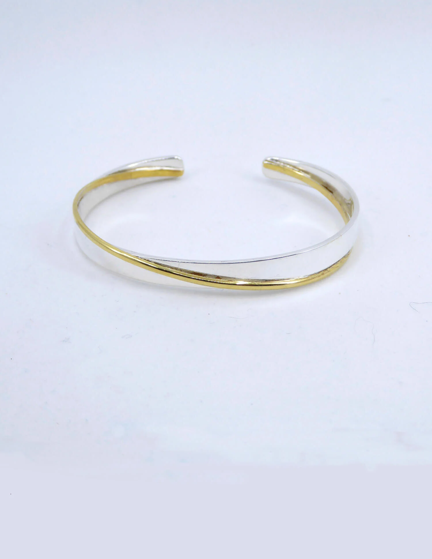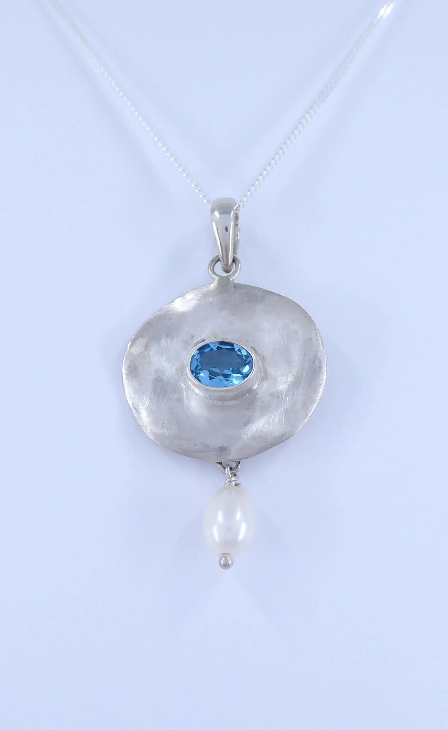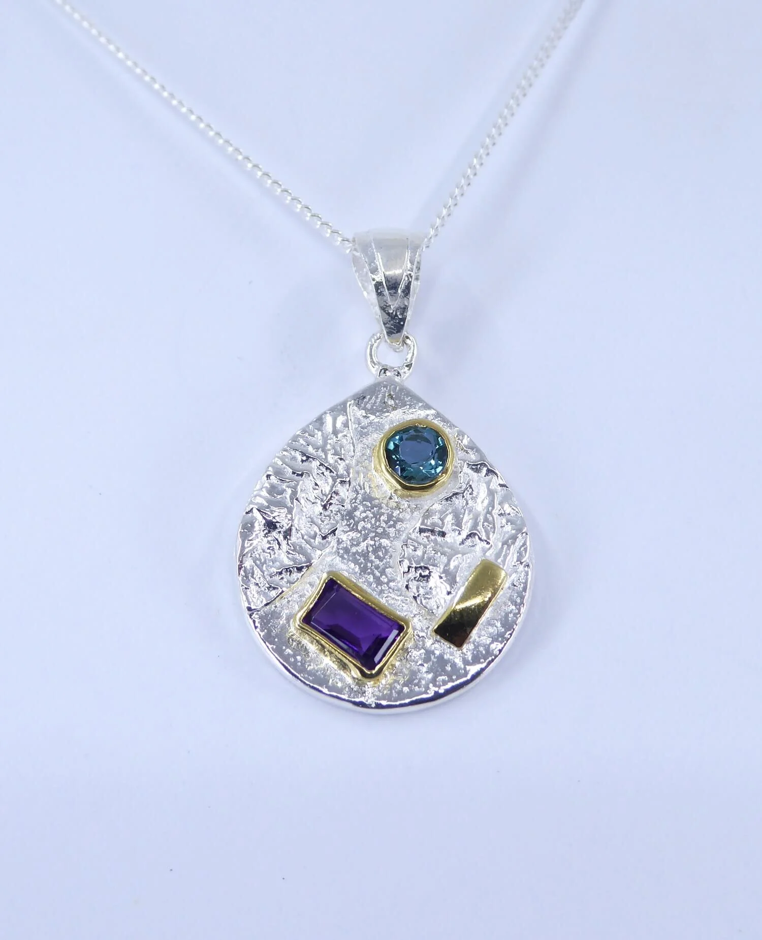 A striking pendant combining polished silver, textured gold vermeil and sparkling faceted gemstones. A glittering oval deep purple amethyst or brilliant green peridot balances atop the straight edge of a bold half moon of textured gold with a silver border. Thin ribbons of polished gold reach down towards a smaller stone of the same colour sitting delicately at the bottom. This is an ageless design that pays homage to the splendours of Art Deco and Art Nouveau with a very modern appeal.